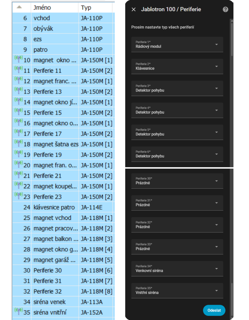Čísla zařízení se musí shodovat s pořadím v JA-Link (F-Link).