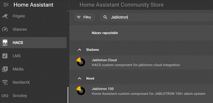 HACS/Hledat – Vyhledejte „Jablotron 100“ a klikněte na něj