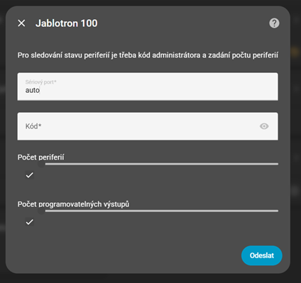 · V části „kód“ vyplňte PIN kód administrátora (správce) vašeho systému Jablotron, definovaný při instalaci zařízení.